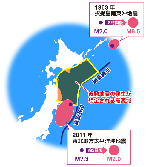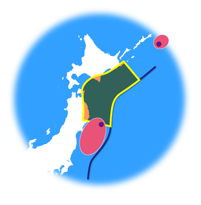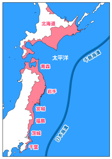 北海道~東日本の東側(択捉島の東方沖から三陸海岸、房総半島の東方沖)には千島海溝と日本海溝という海溝(特に深い海底のみぞ)があり、周辺ではマグニチュード7~9クラスの大きな地震がしばしば発生しています。なかには短時間で連続した発生も何度かあり、また今後にも同じように起きることが考えられます。