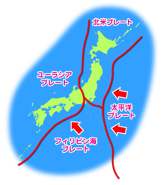 日本列島の地下では4つのプレートがぶつかりあい、巨大な力が生まれてたまっています。地下の岩盤はたまった力に耐えきれなくなると壊れ、ある面(断層)を境にして大きくずれ動きます。これが地震です。このとき、たまっていた力の一部が放出されます。