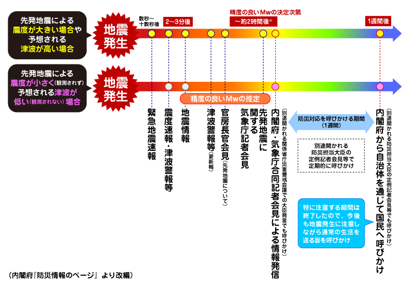その後、防災体制をとりつづけて1週間の間に問題がなければ、特に注意すべき期間が終了したことが内閣府から自治体を通じて知らされるしくみです。