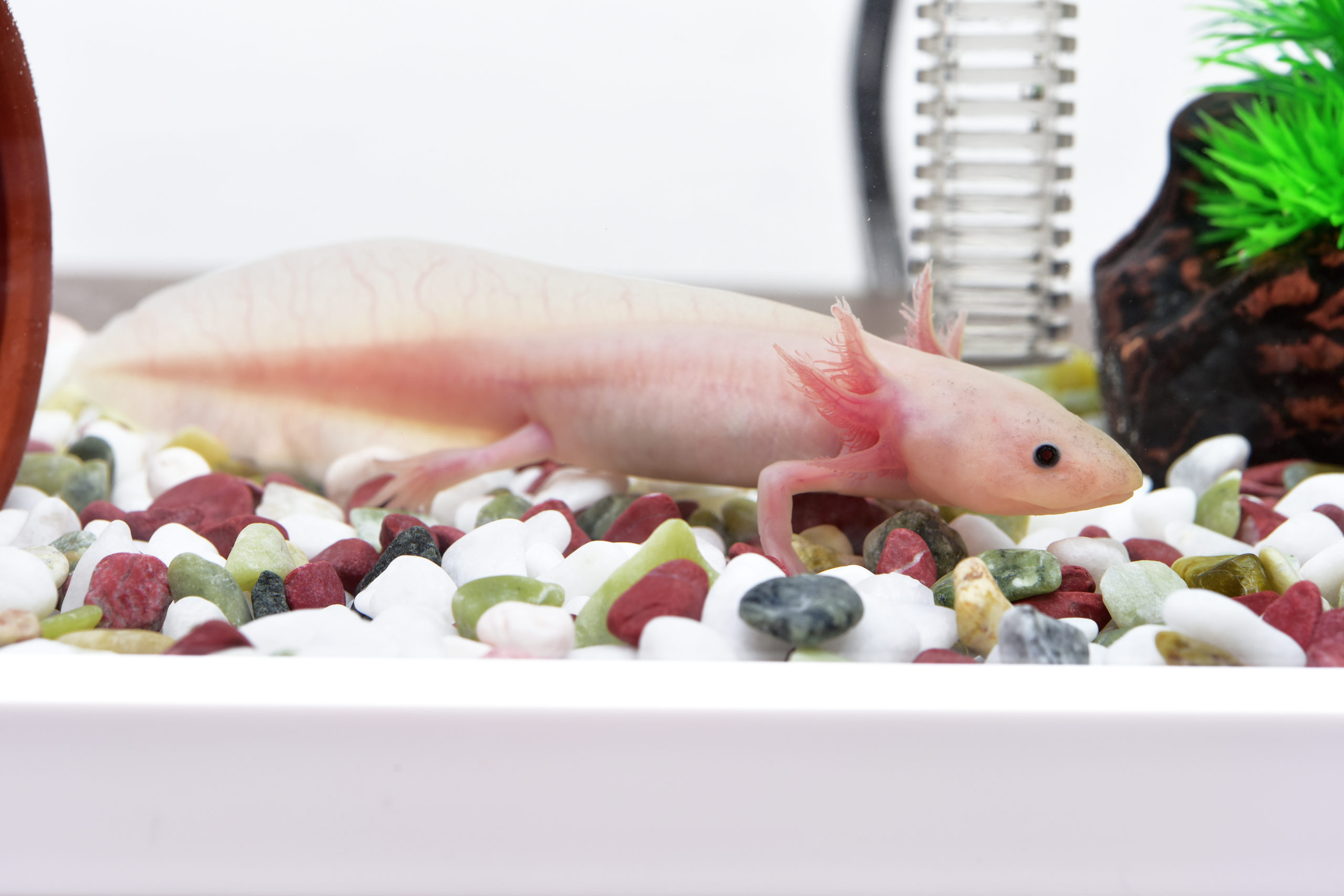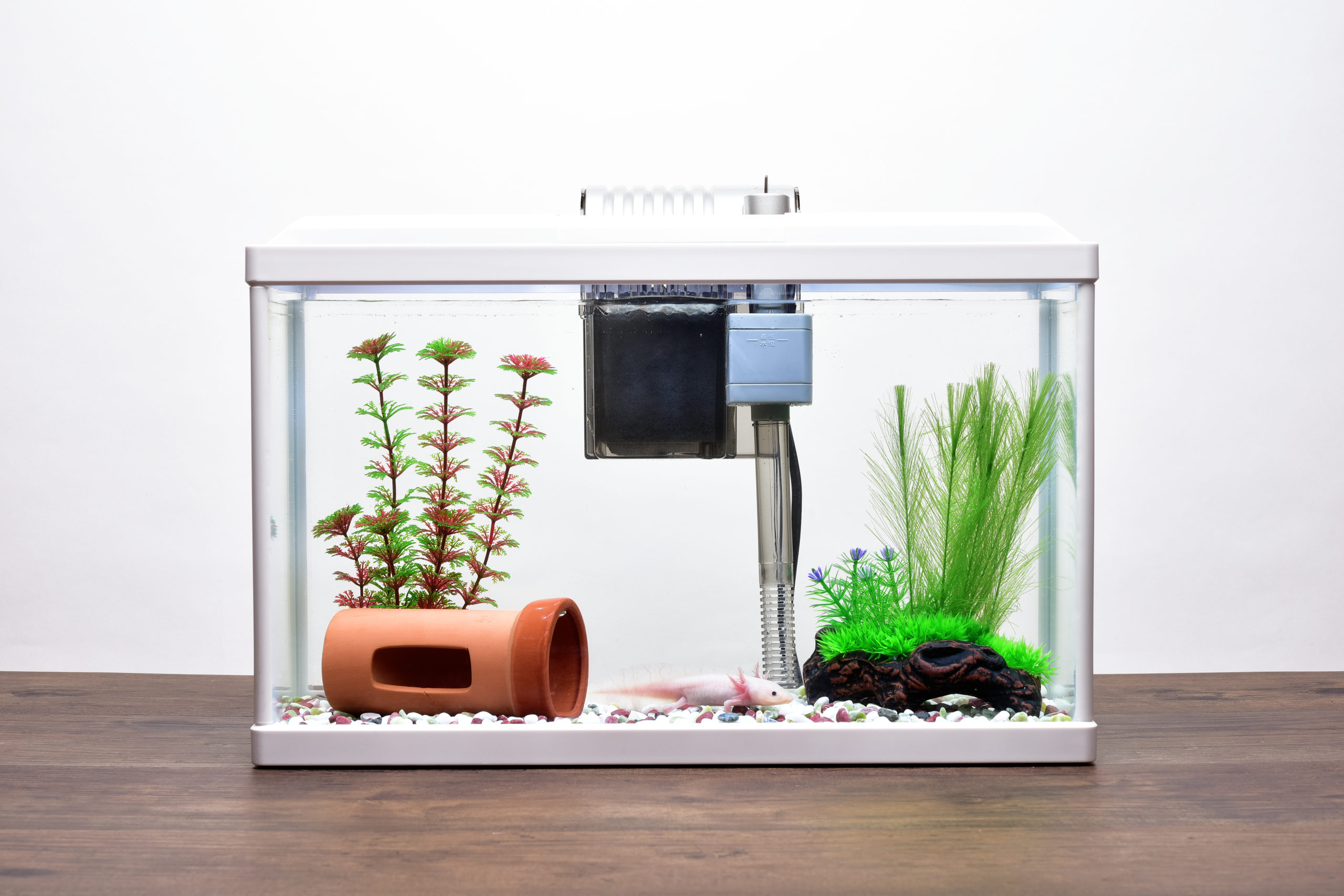 ウーパールーパーの飼育は難しくありません。一般的な飼育ケースに小型フィルターを使用するだけで飼育可能です。室温であれば、ほぼ問題なく飼育できますが、夏場の高水温には少々注意し、涼しい場所で飼育するとよいでしょう。必要であれば、冷却ファンなどを使用しましょう。