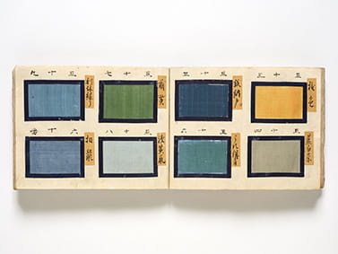 色を楽しむ身近な文化といえば「ファッション」を思い浮かべる人がきっと多いよね。下の画像は、江戸時代~明治時代に京都の染色業者が配布した着物用の色見本。実はこういった着物の色見本には、男性用と女性用で違うものが用意されているそう。下の写真は男性用のもの。女性用の色見本はどんなふうになっているのか、ぜひ会場で確認してね。