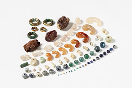昔の人は、一体どんな色を楽しんだのだろう?古墳時代、王やエリートたちは「勾玉」や「管玉」などの玉類を身に着けていた。碧玉、瑪瑙、水晶、琥珀、ガラスなどさまざまな素材が使われていたよ。最初は青色や緑色が中心で、時期が下るにつれ、無色透明や赤、黄色などが加わっていったそう。