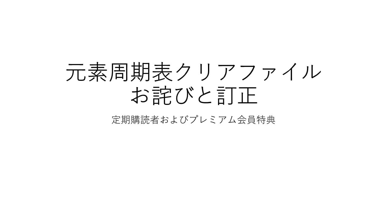 編集部の確認不足が原因で、誤った元素周期表のままクリアファイルが印刷されてしまいました。 定期購読をされているみなさまにおかれましては、大変なご迷惑をおかけしたことを深くお詫び申し上げます。
