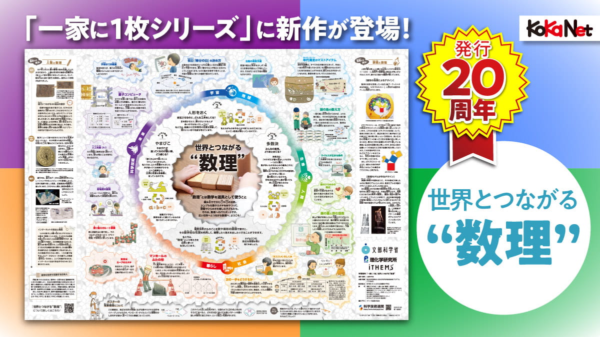 最新の令和6年度は新しく「『一家に1枚』世界とつながる“数理”」を発行!全国の学校などに配布されています。このポスターは、社会のさまざまな場面で使われている”数理“を、イラストなどを用いてたくさんの事例により解説したもので、理化学研究所 数理創造プログラム(iTHEMS)の監修により制作されました。