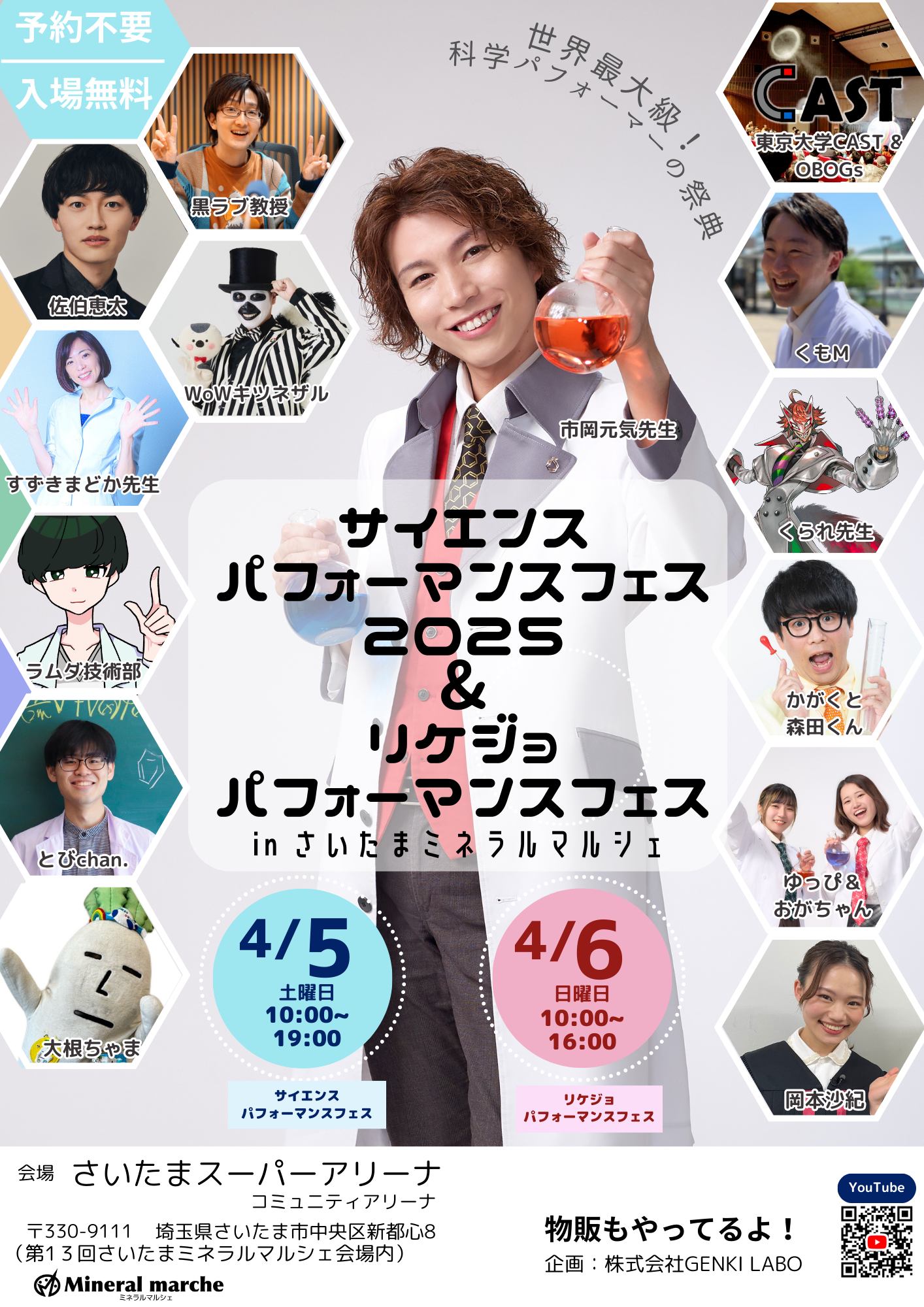 4日(土)には、市岡元気先生主宰のサイエンスイベントも開催されるよ。元気先生やくられ先生はじめ、さまざまなゲストがパフォーマンスを披露。5日(日)には「リケジョパフォーマンスフェス」という女性サイエンスパフォーマーによるステージも。科学が好きな人はお見逃しなく!