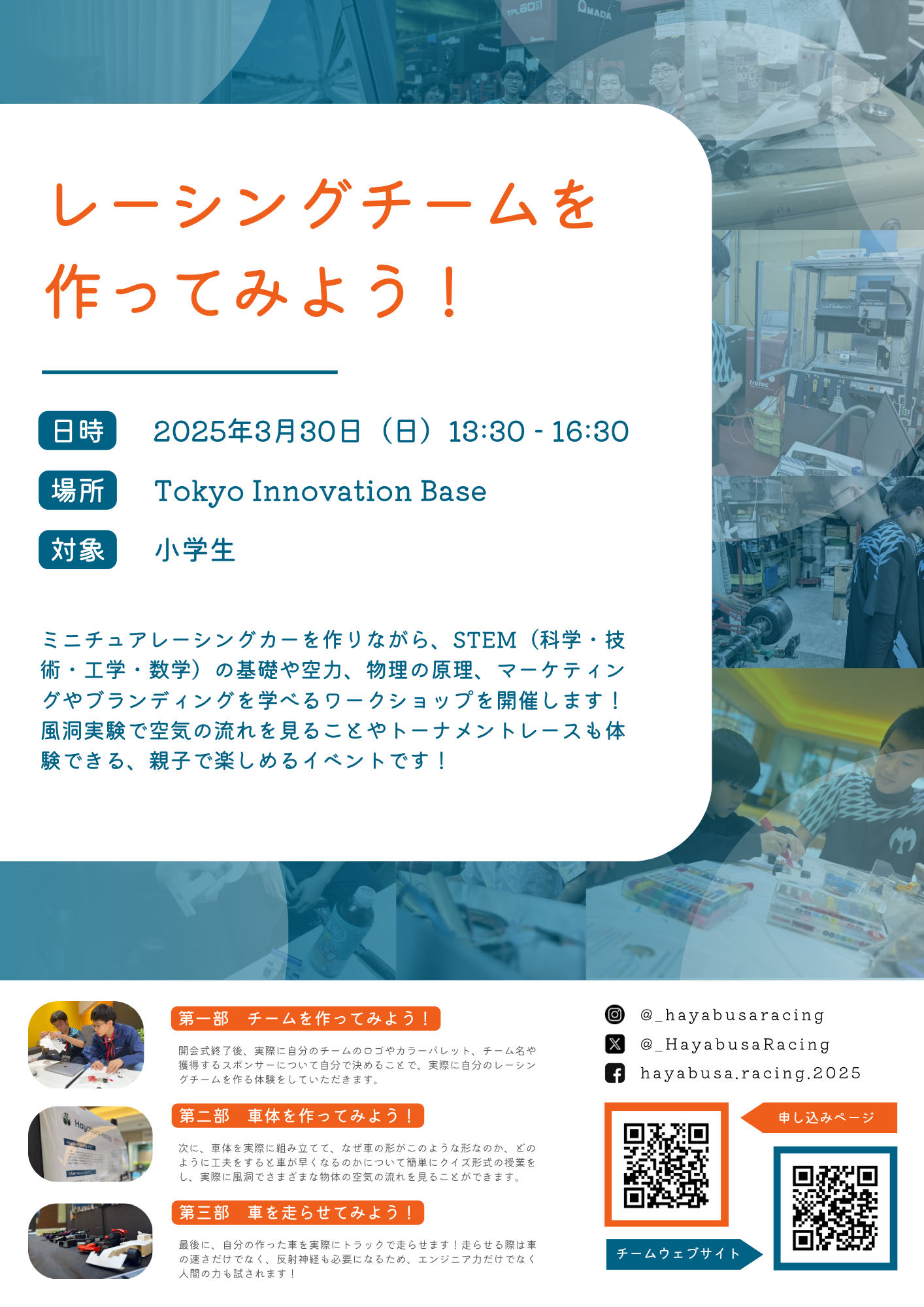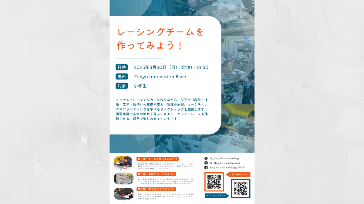 | 参加方法 | 下記フォームより応募 。先着順、定員に達し次第〆切 https://www.hayabusaracing.com/ja/contact-5 |