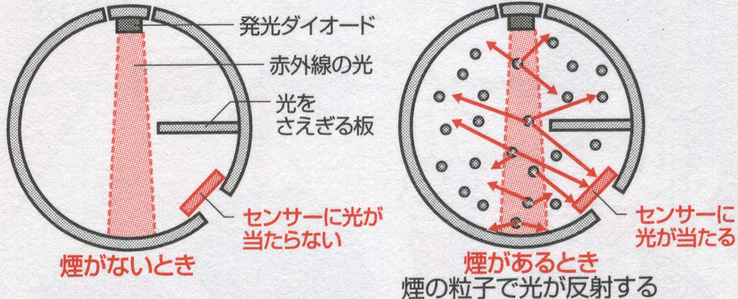 煙を探知する火災報知器は、煙の細かな粒子によって光がいろんな方向に散乱することを利用して煙を探知しています。図のように中が暗くなっているところに、一方から光(目には見えない赤外線)を出しておきます。横のほうには光を感じるセンサーがついています。煙がないときは、光はまっすぐに進みますが、煙があると煙の粒子に当たった光が散乱して、横にあるセンサーに光が届きます。センサーで光を感じると、煙があると判断して、警報音を鳴らすのです。