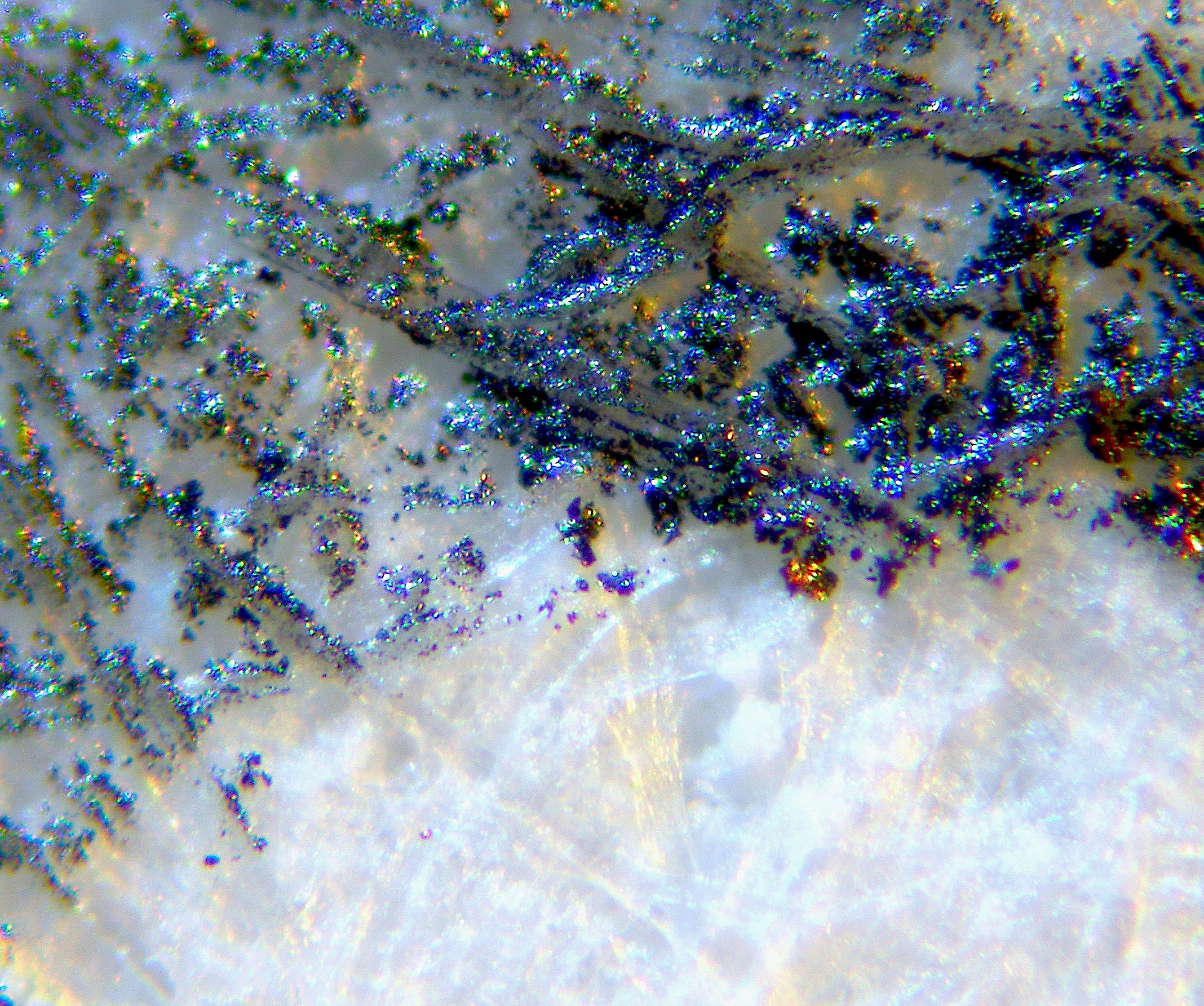 ですから、チョークの粉を黒板の表面からふき取れば、消すことができます。やわらかい布でできている黒板消しでふくと、チョークの粉が黒板からとれて黒板消しにつきます。黒板の表面からチョークの粉がなくなるので、文字などが消える…というわけです。 なお、同じようなことが、えんぴつと紙でも起きています。えんぴつのしんが粉になり、紙をつくっているせんいの間にくっついて、黒い線になります。消しゴムは、しんの粉をくっつけて取るので、えんぴつの線が消えるのです。えんぴつで書いた紙を顕微鏡で見ると、写真のように、しんの粉が紙のせんいにくっついているようすが観察できます。