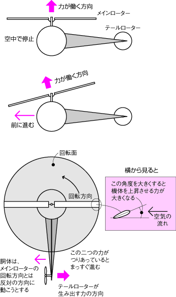 操縦桿を操作して、メインローターの回転面を前に傾けるとヘリコプターは前に進みます。これは、回転面を傾けることによって力が働く方向が変わったからです。また回転面を水平にすると空中で停止することができます。方向を変えるときは、テールローターが生み出す力の大きさを変えてやります。また、上昇するときはローターの羽根の角度を大きくして上に向かう力を大きくしてやります。