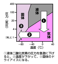 ではなぜ二酸化炭素が凍ってしまうのか? 液体が気体に姿を変えるとき、周囲から熱を奪います(気化熱)。そのため二酸化炭素の温度はいっきに下がります。また、気体が周囲の空気の暖かさや冷たさの影響を受ける暇もないくらい急に膨張することによっても、気体の温度が下がります。この2つの作用によって、気体になった二酸化炭素の温度が急激に下がり固体に変化するのです。