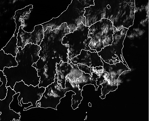 局地豪雨の雲は水平方向に数km~数十km程度広がる積乱雲で、台風は積乱雲からなる規模の大きな渦巻状の雲域です。 衛星写真1は2009年8月24日の東京世田谷局地豪雨のときのものですが、地図の縮尺から考えると、雲が発生しているのはたいへん狭い範囲です。東京23区の南側や東京湾から房総半島の一部にごつごつとした活発な積乱雲(雷雲)があり、世田谷区上用賀の雨量計で1時間に54mmの局地豪雨(総雨量も同じ)となりました。