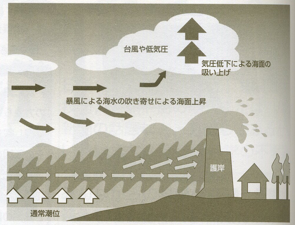 高潮は台風の来襲時に気圧の低下による海水の吸い上げ効果、強い暴風による海水の吹き寄せ、大潮で満潮時が重なるなどどえ、海岸や沿岸から陸地に海水が侵入するものです。昭和34年(1959年)9月の伊勢湾台風では、死者・行方不明者が約5000人も出ていましたが、その7割は高潮によるといわれています。また1999年9月の台風18号では、熊本県不知火町で、防潮堤を越えた高潮によりいっぺんに12人の方が亡くなられました。台風来襲時、特に南に開いた湾(東京湾、伊勢湾、大阪湾、瀬戸内海、有明海など)では高潮に警戒する必要があります。