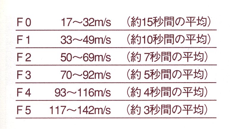 藤田スケール:竜巻やダウンバーストの規模を被害状況から推定するため、シカゴ大学の日本人学者、藤田哲也氏が1971年に考案した基準。日本ではF4以上の竜巻はまだ観測されていない(アメリカはF4やF5の大規模のものがある)。