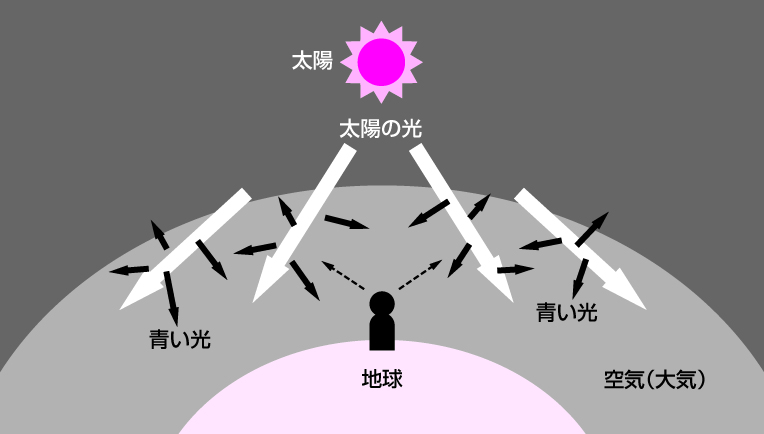 一方、太陽の光にはさまざまな色がふくまれています(プリズムなどで虹の色に分けられるのがその証拠です)。私たちが空を見上げたときに眼にはいるのは、四方八方に広がっていく太陽の光のうち、空気中でレイリー散乱を起こした青い光なのです。なお、散乱せずにまっすぐ通り抜けた光は、青い成分が減って赤くなっています。より長い距離を通ってたくさんの青を失った残りの赤い光が見えるのが、夕焼けや朝焼けです。