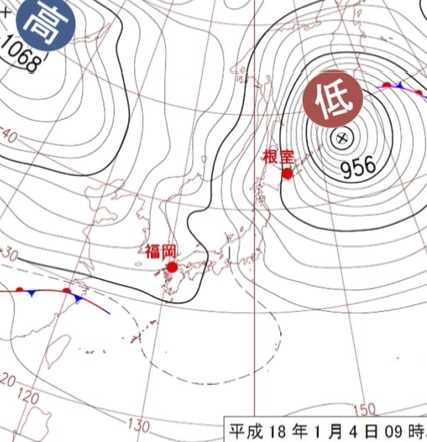 天気図で等圧線がたてじま模様の西高東低の冬型のとき、季節風と強い寒気の影響で日本海側の地方は雪が降ります、一方季節風が日本の脊梁山脈を越えると、乾燥した季節風が吹き。太平洋側の地方は晴天となります。これは気象衛星でよくわかります。冬に太平洋側の地方で晴れの日が多いのはこのためです。ちなみに太平洋側で1年のうち最も晴天率が高いのは1月3、6、19日です。このあたりを簡潔にずばりと表現したのはノーベル賞作家の川端康成。作品「雪国」の冒頭「国境の長いトンネルを抜けると雪国であった」にあるトンネルとは、太平洋側から日本海側に抜ける、上越新幹線清水トンネルのこと。それぐらいガラリと天気が違うものなのです。