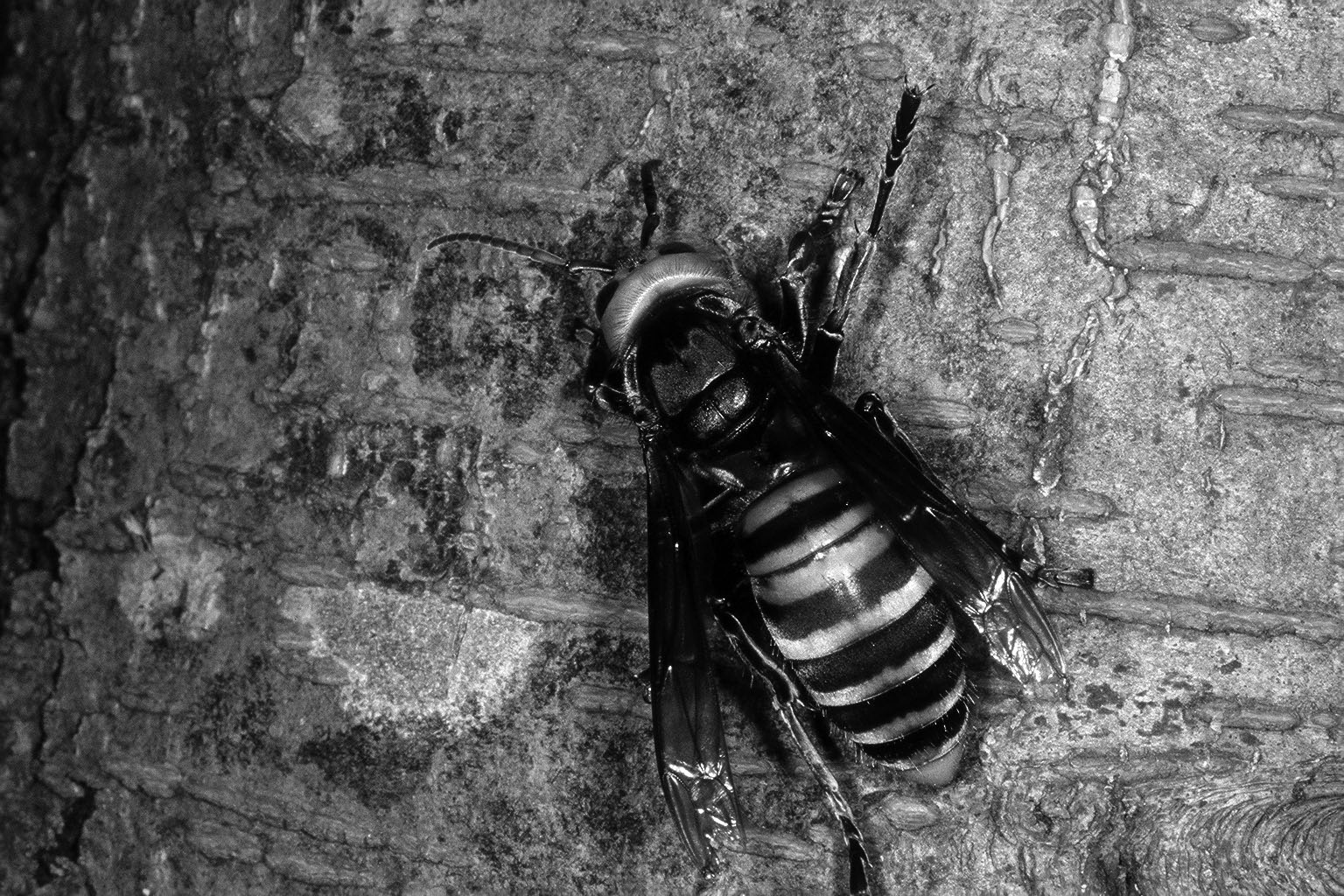 オレンジと黒の縞模様が目立つオオスズメバチ。強い毒を持っていて危険なので、絶対にさわらないこと