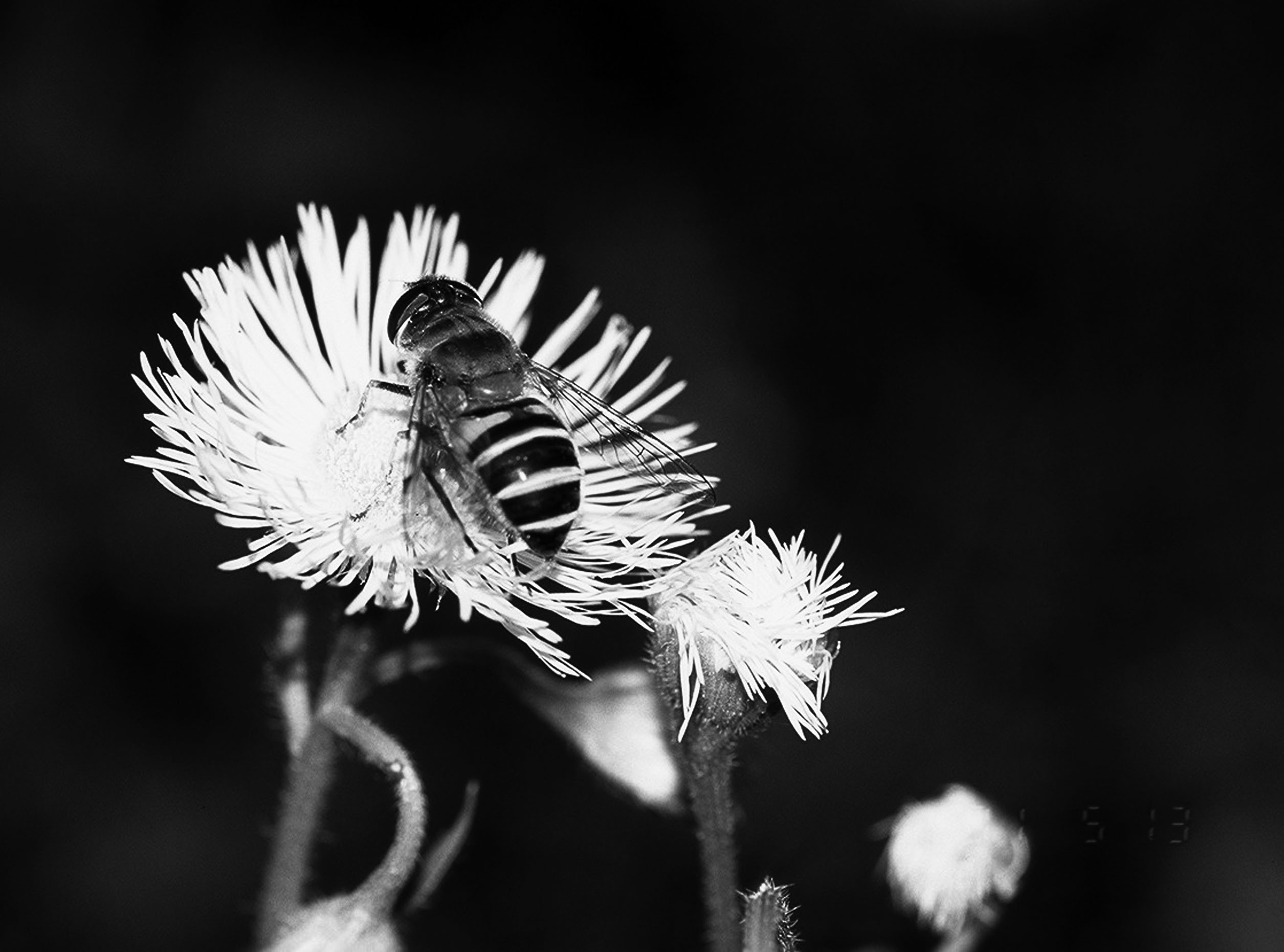 ハチによく似た姿をしているけれど無害なシマハナアブ。