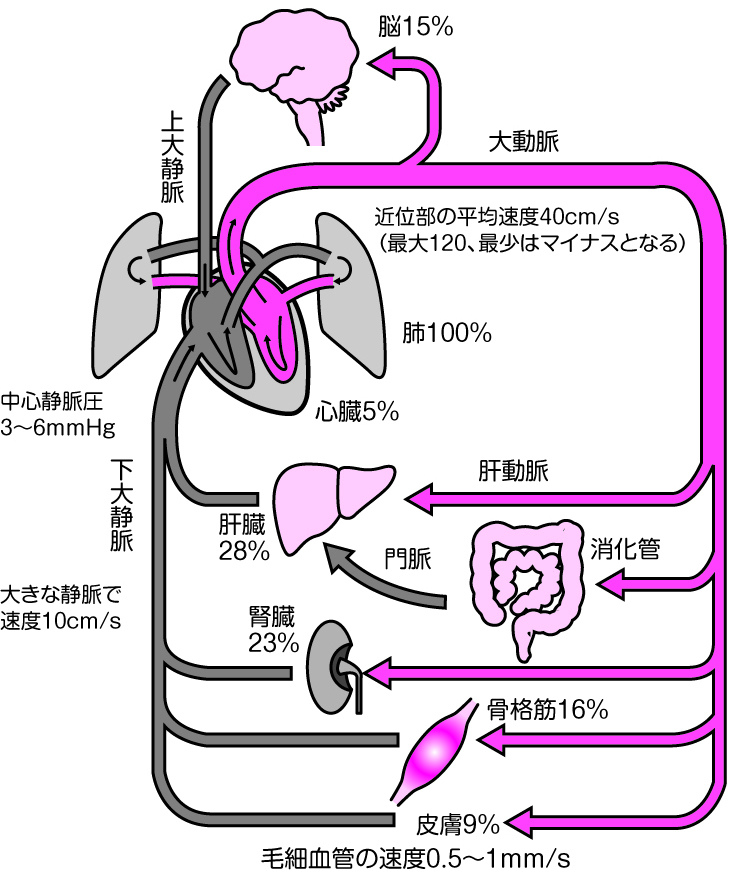 心臓の筋肉が1分間に受け取る血液の量はおよそ250ml、骨格筋の受け取る血液の量はおよそ900mlになる。