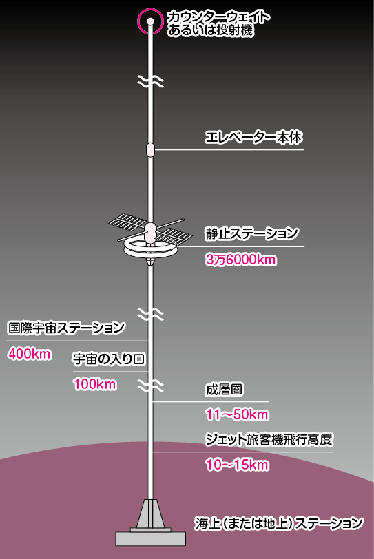 ご質問の通り、地球と宇宙ステーションを強いケーブルでつなげて、そのケーブルを昇り降りする乗り物をつくろうとする計画があります。この計画は50年前以上前にロシアの科学者ユーリ・アルツターノフが考え出したもので「宇宙エレベーター」と呼ばれました。今ではロケットでたくさんの材料を宇宙へ運び、国際宇宙ステーションをつくることもできるようになったので、宇宙エレベーターもつくれるかもしれないということで、その実現のための研究が始まっているのです。