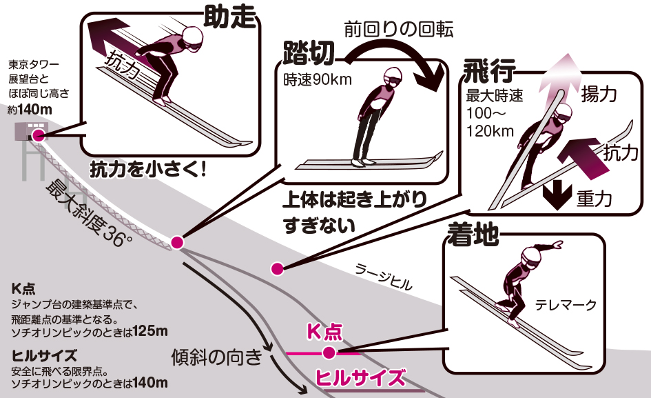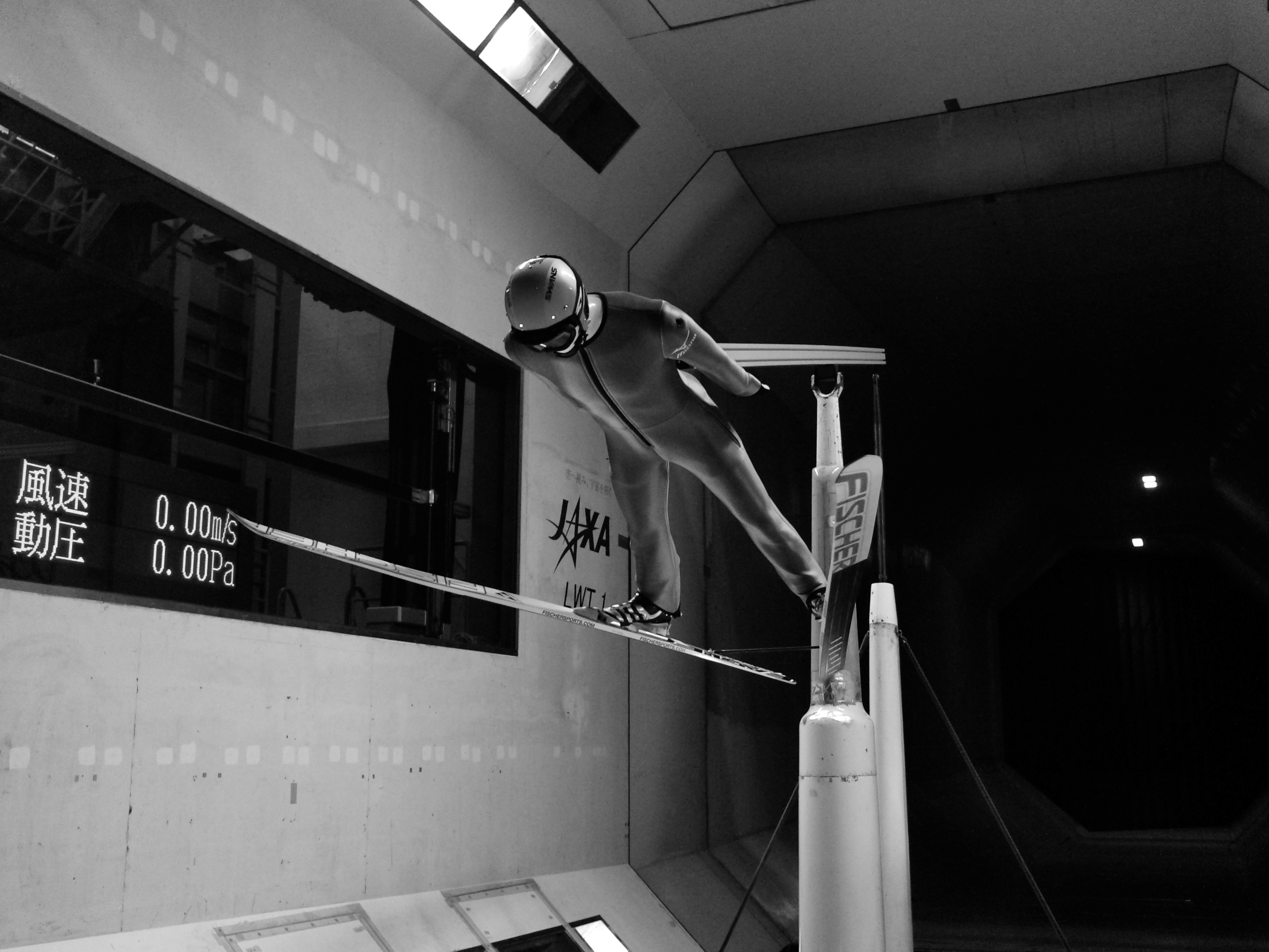 運動場を走れば、髪の毛がさらさらとなびきます。空気から力(空気力)を受けているからです。高速道路を走る車から手を出せば(良い子のみなさんは真似しないように)、もっと強い空気力を受けます。ジャンパーも高速道路上の車と同じくらいのスピードで飛んでいます。遠くまで飛ぶコツは、この空気力とうまく付き合うことです。