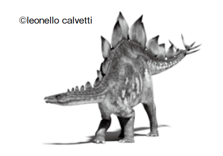 ステゴサウルスの想像図。背中にたくさんの骨の板が並ぶ。