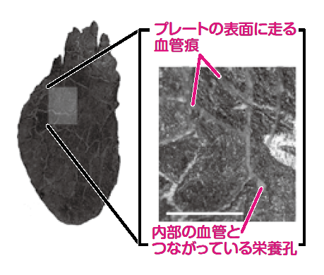 骨板の化石を詳しく観察すると、血管や栄養孔があることがわかった。