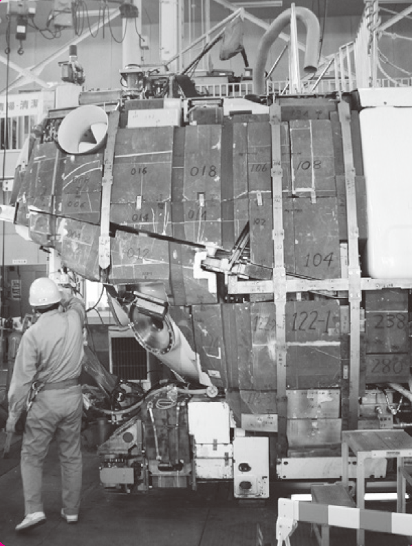 日本を代表する潜水調査船「しんかい6500」を例に説明しましょう。「しんかい6500」は、名前の通り、深さ6500mまでの海に潜ることができる潜水調査船ですが、そのまま海に入っても、深海へ潜っていけません。なぜでしょう? 写真1は潜水船のカバーを外したところですが、番号の書かれた、黒っぽいものが見えます。これは潜水船に取り付けられている「浮力材」です。潜水船には、たくさんの浮力材が取り付けられていて、この浮力材の水に浮かぼうとする力で潜水船は深海から水面に戻ってくるしくみになっています。