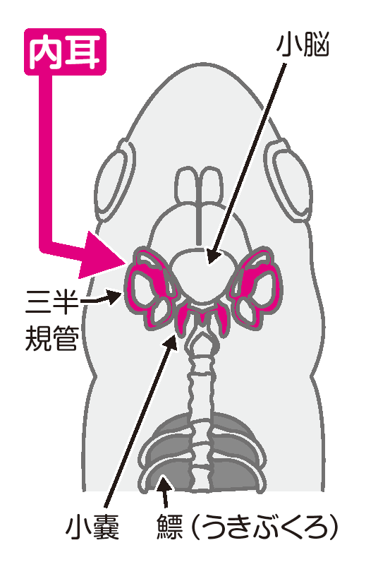 魚には耳たぶ(耳介)も耳の穴(外耳道)もありませんが、頭の中には内耳が1対あります。その内部には、姿勢を感知する三半規管や、音を感知する小嚢などの耳石器官があり、ここで音波(水の圧力の変化)を感知します(図1)。