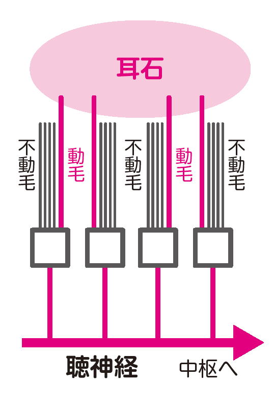 図2 感覚毛が耳石とのわずかなズレを感知し、脳に伝達する。