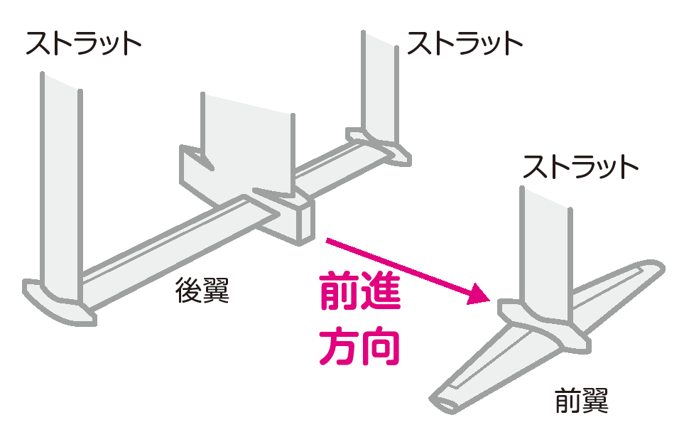 航空機は主翼や尾翼という翼を持ち、翼に働く揚力という上向きの力を利用して空気中を飛んでいます。ジェットフォイルは水中翼船の1つで、船体の下に図1のような水中翼を持っています。スピードが遅いときは普通の船と同じく浮力で浮いていますが、高速で進みだすと水中翼が航空機の翼と同じように揚力を生み出し、船体の主要部分(主船体)を空中に浮き上がらせて進みます。つまり、周りの流れが空気という気体なのか、水という液体なのかという違いはありますが、揚力が生じるしくみは航空機の翼も水中翼も同じなのです。