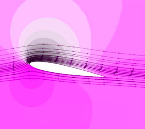 流れの違いは、翼の上面に低い圧力を、下面に高い圧力を生みます。図2は、翼の周りの流れの様子と圧力を、コンピューター計算したものです。流れの様子を曲線で、圧力の大きさを濃淡で示してあります。圧力の高いところが濃く、圧力の低いところが薄くなっています。下面の方の圧力が高く、上向きに力が働くことがわかります。これが揚力で、ジェットフォイルはこの力を利用して、主船体を空中に浮き上がらせて進んでいます。