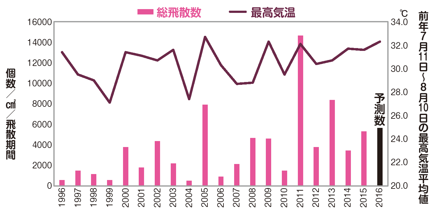 この図の気温と総飛散数との相関から予測式を導いて計算すると、2016年の予測数は5892個になります。気温だけでは実際の予測に不充分ですが、いろいろな気象因子(日照時間、降水量など)も加えて計算すればもっと正確な予測が可能になります。