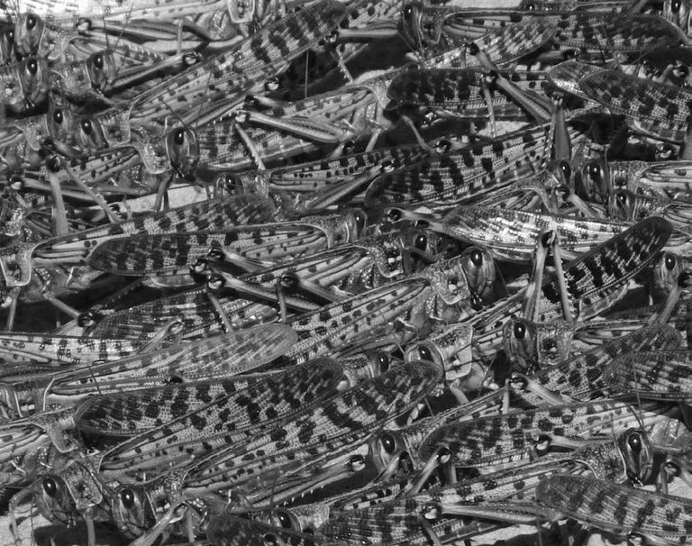ところが、珍しく大雨が降ると、草が枯れるのが遅くなるため、バッタは旅に出ずに数世代連続して繁殖します。バッタの繁殖力は高く、あっという間に仲間の数が増えます。草が枯れ始めると、草が残っている狭い範囲にたくさんのバッタが集まってきて、ますます数が多くなります。