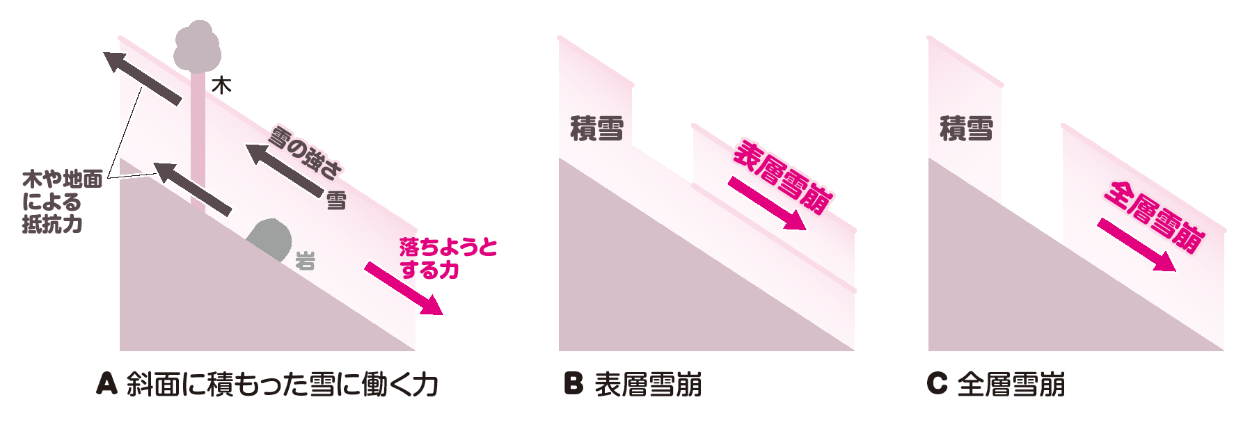 一方、雪の量は変わらないけれど、雪の強さが小さくなる場合でも雪崩が起きます。雪の強さが小さくなる場合には、気温が急激に上がることによって雪がたくさんとける場合などがあります。また、登山やスキーなどで雪の上に人が乗ったときは、人の重さによって雪の弱い部分が壊れたり、落ちようとする力が大きくなったりして雪崩が起きることもあります。雪崩の種類には、とけてぬれている雪が崩れる湿雪雪崩と、とけていない雪が崩れる乾雪雪崩があります。また、積もった雪の上側だけが崩れる表層雪崩(図B)と、積もった雪の全部が崩れる全層雪崩(図C)があります。これらを組み合わせて、乾雪表層雪崩や湿雪全層雪崩などと呼びます。