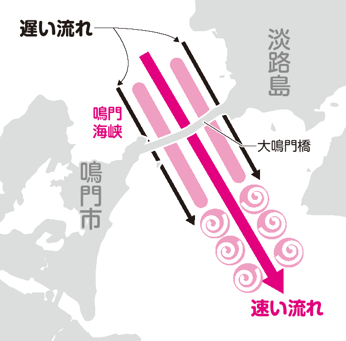鳴門海峡では海岸と中央で流れの強さの差が異なり、渦ができやすい状態になっている