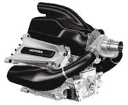 最新のF1 用ターボエンジン。横向きに伸びた黒い筒状の部分が排気管。