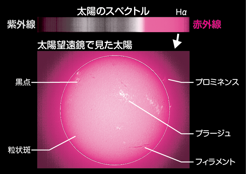 太陽望遠鏡にはさまざまな種類がありますが代表的なのは、太陽に含まれる水素が放つ特定の光(Hα線)だけを通す特殊なフィルターを使うタイプ。太陽が放つ光に含まれているさまざまな波長の光(電磁波)のうち、特に目に有害な赤外線と紫外線がフィルターによってカットされます。