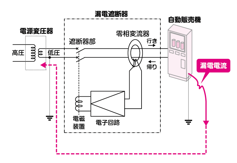 図は、漏電遮断器と自動販売機を結んだ回路図です。漏電遮断器は、漏電を検出する零相変流器、電子回路、電磁装置、遮断器部で構成されています。