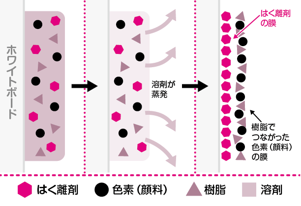 ホワイトボード専用のマーカーには、さらに「はく離剤」という成分が含まれている。溶剤が蒸発するのは同じだが、このとき、はく離剤がボードの表面に集まって薄い膜のようになる。色素が表面に密着するのを防ぐので、こすれば簡単に消せるというわけだ。