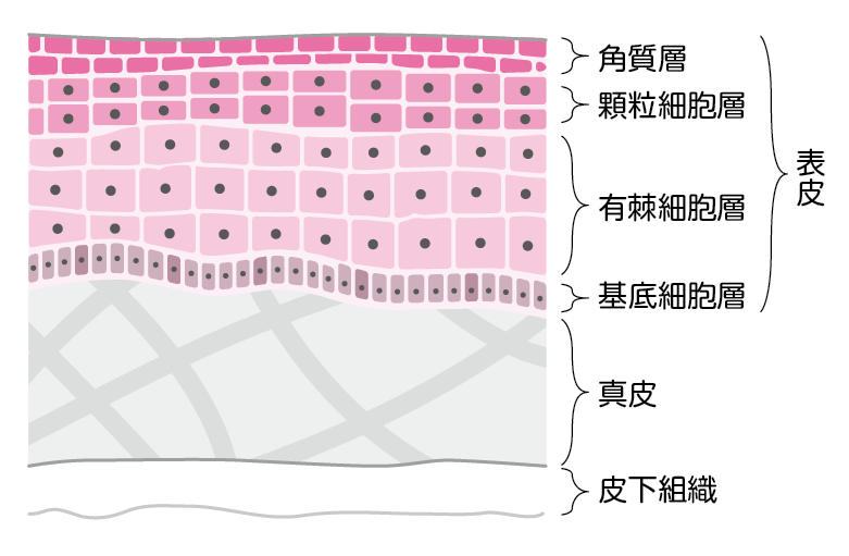 まず、皮膚の構造を簡単にご説明しましょう(図)。皮膚は表皮、真皮、皮下組織の三層から構成されています。表皮は角質層、顆粒細胞層、有棘細胞層、基底細胞層、基底板からできていて、角質層が目に見える皮膚の部分です。