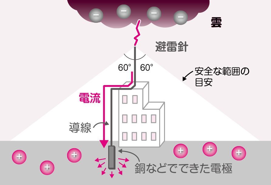 ただし、避雷針で守られる範囲は、下方60°くらいに限られます。ですから、ゴロゴロという音が聞こえてきたら、はやめに建物の中に避難するようにしましょう。外にいる場合は、木など高い物の近くには近づかないようにしましょう。