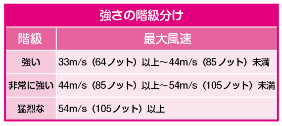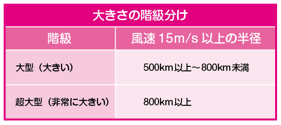 台風情報では「大型で非常に強い台風○○号は」というように勢力を表します。(気象庁HP参照)