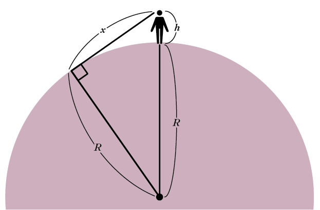地球は丸いので、その断面は円で近似することができます。その円の半径をRとして、図のように地面から高さhのところに目の位置があるとしましょう(図)。そして、そこから見た水平線までの距離をxとすると、xは目の位置から地球に引いた接線の長さになりますね。地球に接したところで、接線は半径方向に直交しますから、
