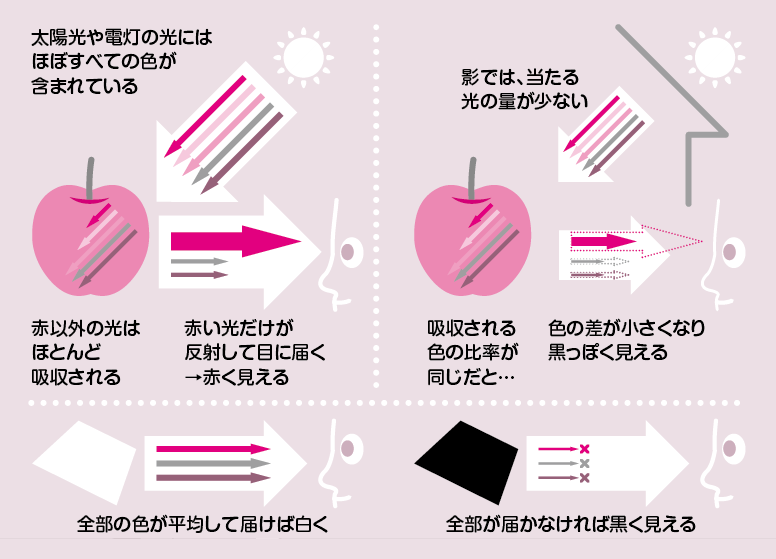 ものの色が見えるのは、ものからはね返る光に「色のかたより」があるためだ。例えば全体で10の光がリンゴに当たっているとき、リンゴからはね返る光に含まれる色が赤8:緑1:青1だと、ほぼ赤に見える。はね返る赤、緑、青が同じ量なら白く見えるし、光がはね返らなければ赤0:緑0:青0で黒く見える。