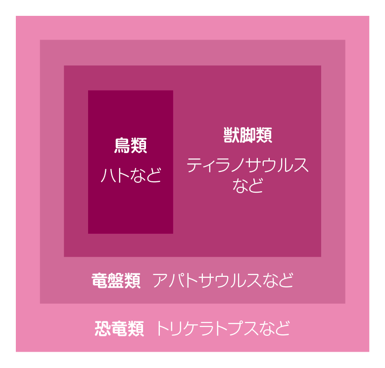あれ? じゃあ、こうした特徴を持つ一部の獣脚類と鳥類の違いは何でしょう? 実は、羽毛や翼などを持つ獣脚類の化石がたくさん見つかってきたことで、一部の獣脚類と鳥類の違いがわからなくなってきました。そのため、「獣脚類から鳥類が進化した」のではなく、「鳥類は獣脚類の一部」ということがわかってきたのです。なお、獣脚類には鳥類ではない恐竜たちもたくさんいます。例えば、有名な肉食恐竜であるティラノサウルス(Tyrannosaurus)などがそうですね。