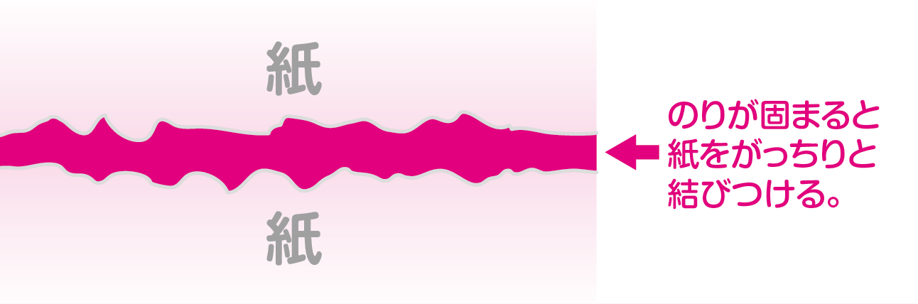 紙の表面の凹凸にのりが入りこみ、乾燥して固まることで接着する。