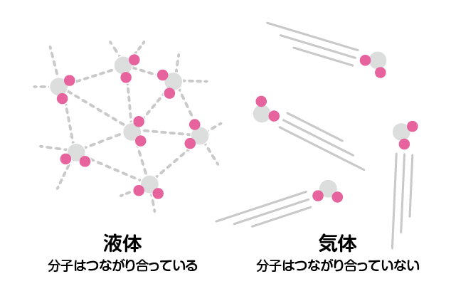 液体の水と気体の水蒸気の最も大きな違いは、分子(物質をつくる小さな粒)のつながり合いがあるか、ないか。液体のとき、水分子はつながり合っているが、気体のときはバラバラに飛び交っている(図1)。何らかのエネルギーによってつながり合いが壊れると、水は水蒸気に変化するわけ。