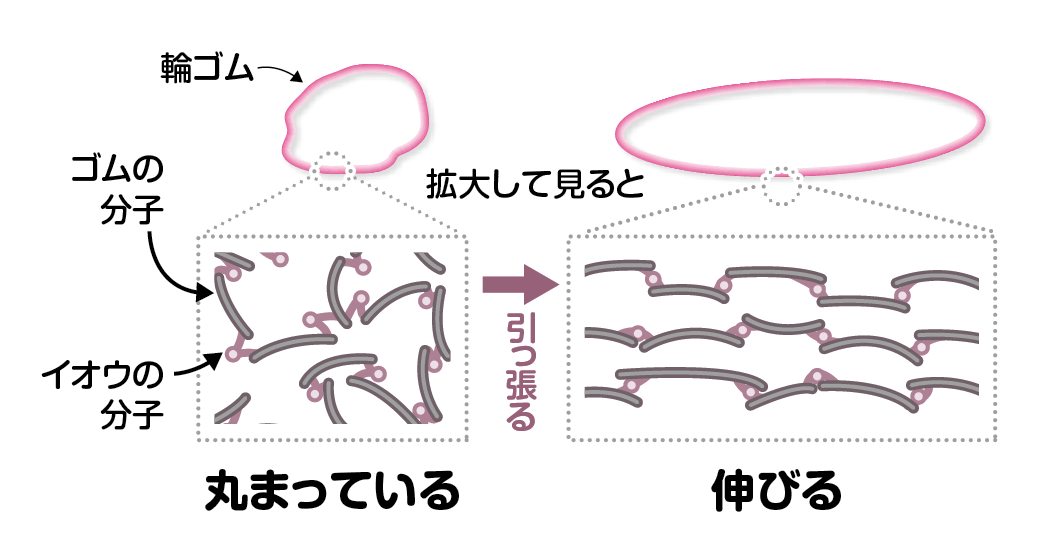 また、輪ゴムは伸びても、引っ張るのをやめると元の長さに戻ります。輪ゴムの分子は細長いのですが、普通は丸まった形になる性質があります。そのため、伸びても元の長さに戻るのです。