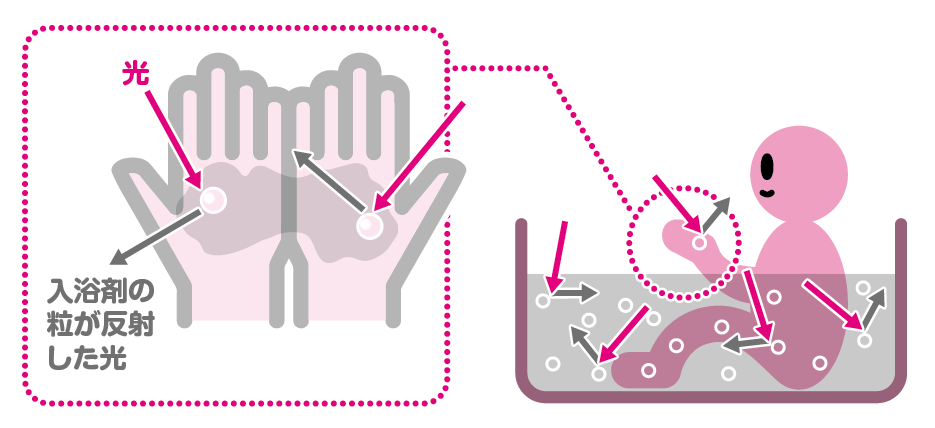 お風呂のお湯は元々透明ですが、入浴剤を入れると、入浴剤の粒が光を反射して色がついて見えます。水に溶けた入浴剤が反射する光はとてもわずかで、少ない量ではほとんど色が見えませんが、たくさんの量が集まると見えるようになります。お風呂いっぱいの水の中には、入浴剤の粒がたくさんあるので色を見ることができます。でも手ですくった水にはほんのちょっとの粒しかありません。なので、反射する光の量が少なくて、入浴剤の色はほとんど見えなくなってしまうのです。