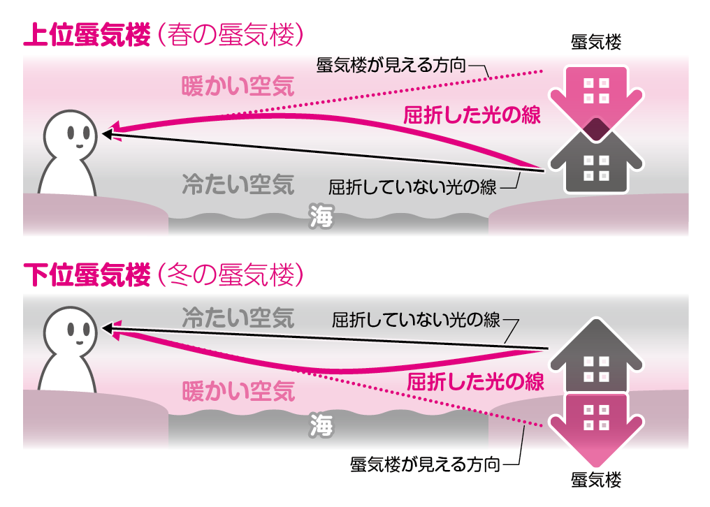 蜃気楼は大気中の光の屈折によって、遠くの景色が伸びたり逆さになったり、実際とは異なって見える現象です。実際の風景の上に虚像が見える上位蜃気楼と、実際の風景の下に虚像が見える下位蜃気楼があります。